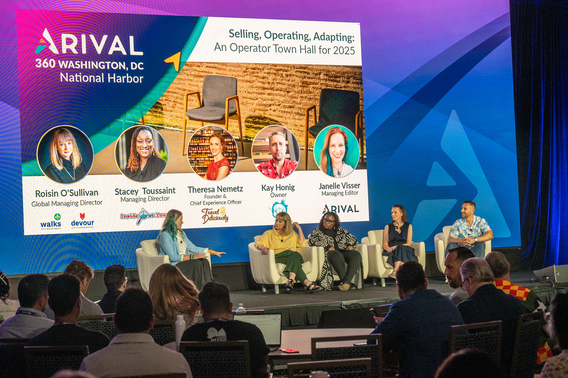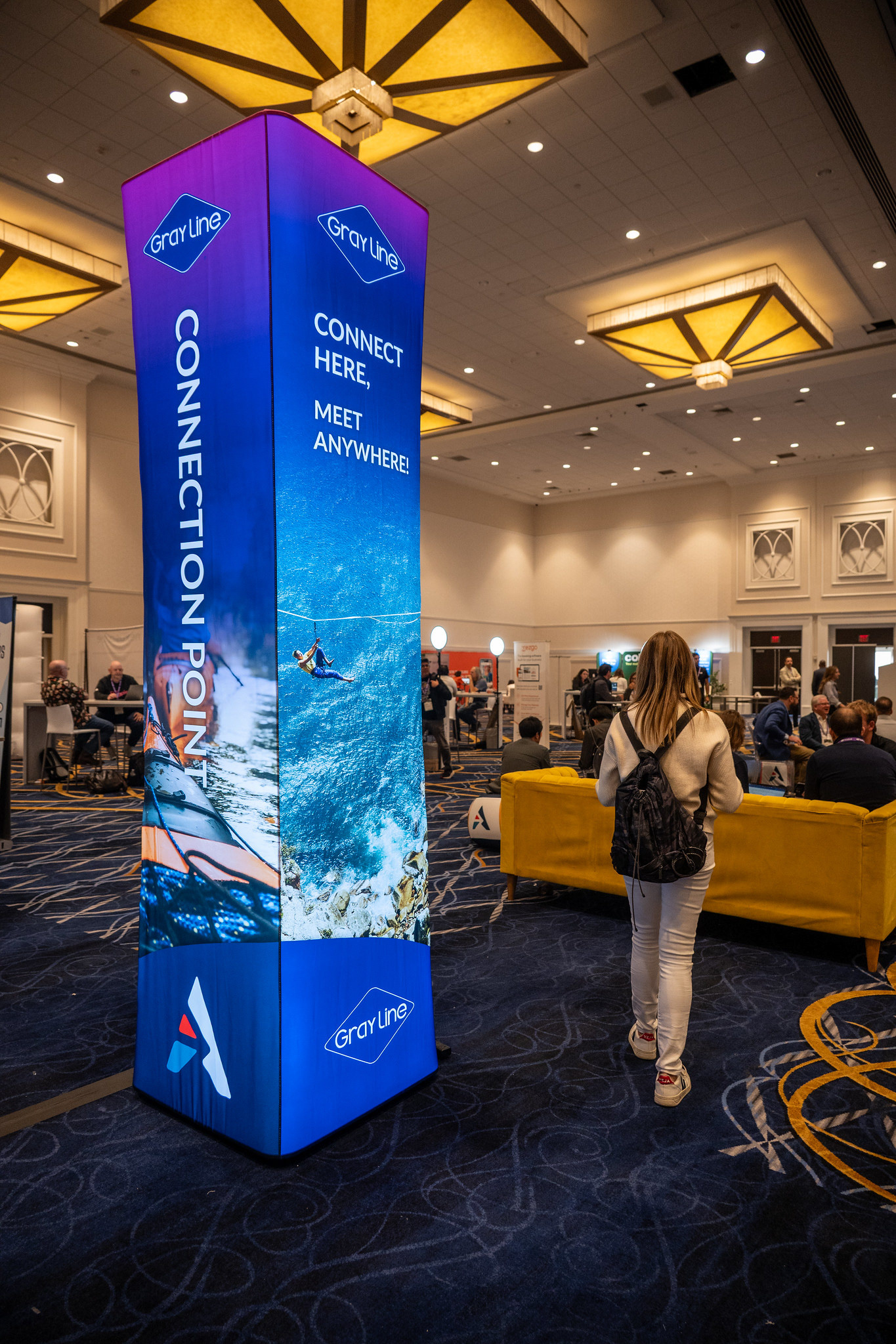 This is a light up "wavelight" tower, sponsored by Grey Line, as a location for our attendees who planned meetings through the event's app to connect with one another. It had to include the sponsor's logo and colors (and enough of their branding for them to be happy), while still showing off arival's colors and event brand. We also had to make this tower stand out against our other branding, since when it blends in too much, the attendees can't find it as easily